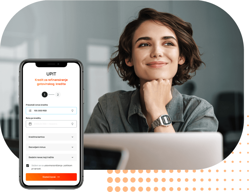 Vremena je malo, obaveza mnogo, a novca uvek nedovoljno. Srećom, Uzmi Kredit ti može pomoći da rešiš makar deo ovih problema. Naša platforma i kreditni savetnici su tu da ti pomognu da apsolutno spreman odeš u banku. Osmislili smo sistem koji te povezuje sa vodećim bankama u zemlji i omogućava ti da u nekoliko poteza saznaš uslove za svoj stambeni, keš, auto, ili refinansirajući kredit i pokreneš proceduru za podizanje kredita.
