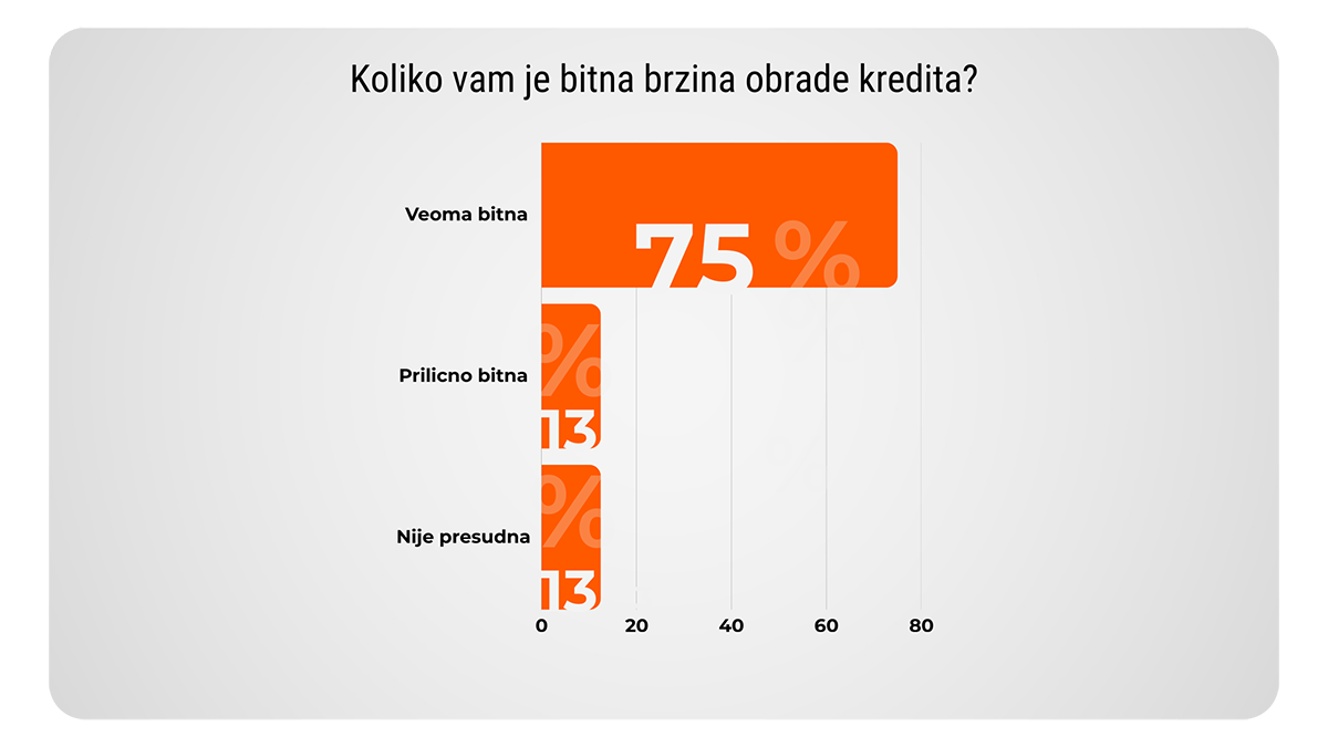 Na osnovu našeg istraživanja, najveći deo ispitanika smatra da je brzina obrade kredita izuzetno važna. Konkretno, 75% od ukupnog broja, izjavilo je da im je brzina obrade kredita “veoma bitna”. Ovaj rezultat jasno ukazuje na to da mnogi smatraju da je brzo donošenje odluka ključno za njihovo finansijsko planiranje i ostvarivanje želja.