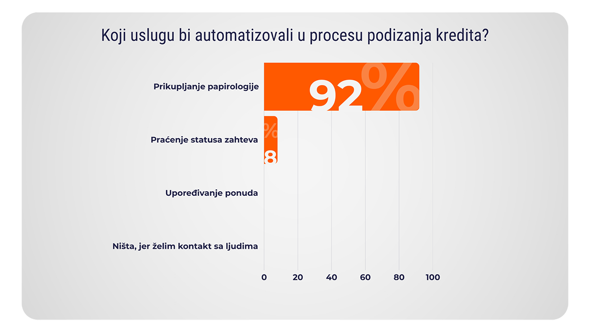 Već na prvi pogled postaje jasno da skupljanje dokumentacije za kredit predstavlja ubedljivo najveći problem. Gotovo 92% ispitanika navelo je upravo papirologiju kao deo procesa koji bi najradije automatizovali. Ovaj podatak ne iznenađuje, jer je administrativni deo često najsporiji, najmanja jasan i najzahtevniji za korisnike.